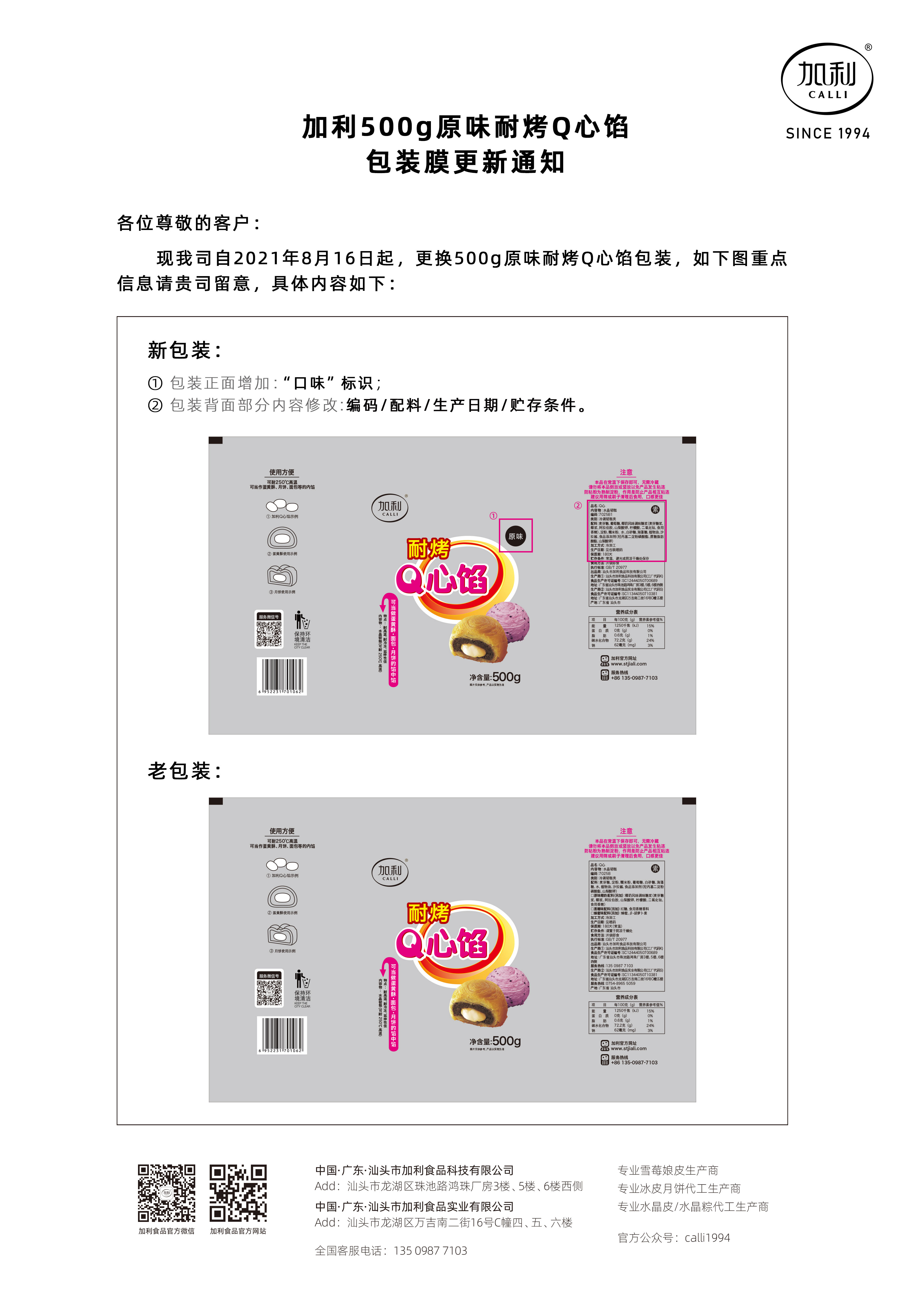 加利食品500g原味耐烤Q心餡包裝膜更新通知